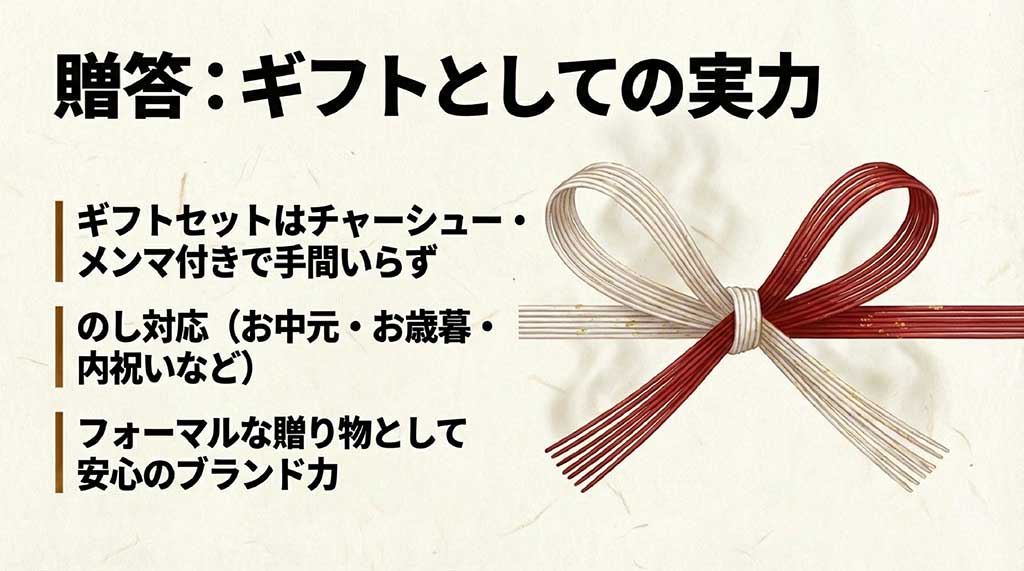 このように、お祝い事からお悔やみまで幅広く対応しているため、内祝いや香典返しといったシーンでも「誰もが知る名店の味」を自信を持って選ぶことができます。ギフトセットのサイズ感も、185×240×60mm程度(4食セットの場合)と、手土産としても持ち運びやすい絶妙なボリューム。ラッピング対応をしてくれるショップを選べば、さらに丁寧な印象を与えられます。贈り物としての詳細は、ラーメンギフトに添えたい美味しいトッピングのアイデアなども参考にしつつ、相手の好みに合わせたセットを選んであげてくださいね。