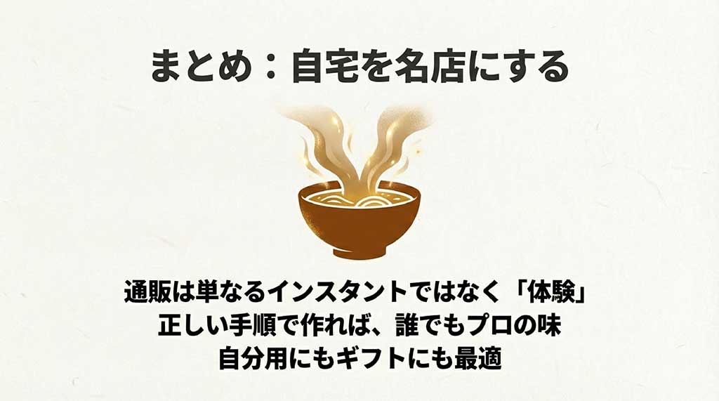 しかし、あえて「通販」を選ぶ理由は、その「圧倒的な構造の厚み」にあります。コンビニ商品はあくまで「限られた条件で再現された味」ですが、通販製品は「西山製麺の熟成生麺」と「店舗の脂(ラード)の量を再現したスープ」という、本物の構成要素がそのままパッキングされています。特にスープの重厚感と、麺を啜った時の鼻に抜ける香りは、やはり通販の生麺でなければ到達できない領域。手軽さを重視するならコンビニ、最高の食体験を追求するなら通販、とはっきり使い分けるのが賢明ですね。どちらが良い悪いではなく、楽しむシーンに合わせて選ぶのがラーメン愛好家の心得かなと思います。